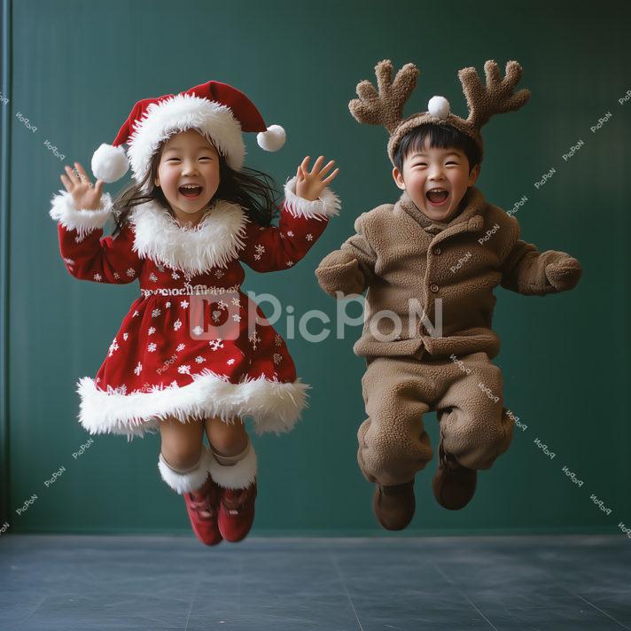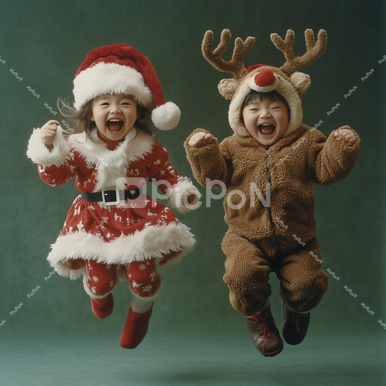 クリスマス、サンタクロースの格好をした女の子とトナカイのツノをつけた男の子がジャンプしている 女の子は白いモコモコのついたスカート、赤いブーツ、男の子は茶色い上下 楽しそうに大きな口を開けて笑っている