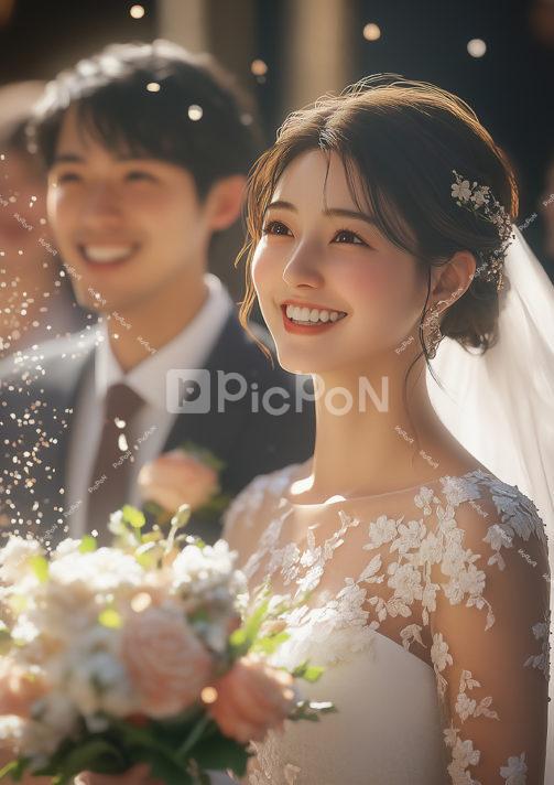 洋装の結婚式 夫婦 ウエディングドレスの新婦 ウエディングドレスを着てピンクと白い花のブーケを持った新婦 スーツを着た男性の結婚式 フラワーシャワーのなか笑顔の様子