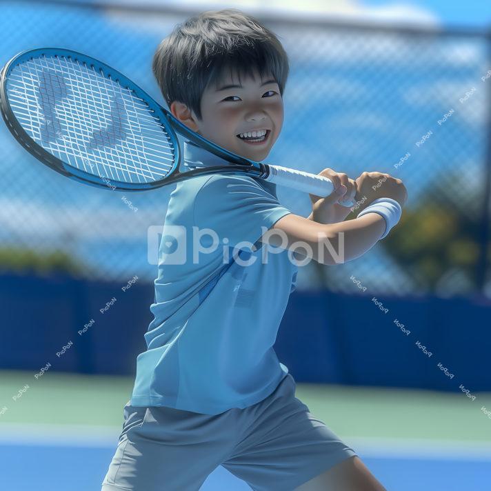 テニスコート、男の子がラケットを振っている 空色のTシャツを着て青い短パンを履き楽しそうに笑っている ポーズをとっている 得意げ
