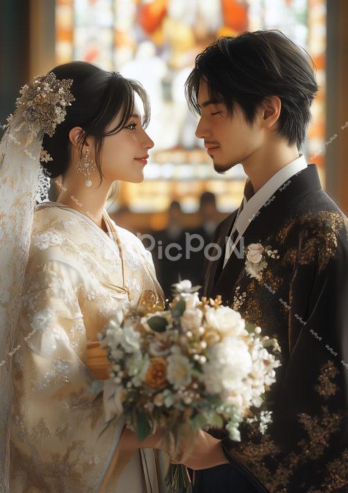 和装の結婚式 夫婦 白い花のブーケを持って白い着物を着た若い女性と黒い着物を着た髭の生えた若い男性の結婚式 ステンドグラスの前で向かい合って微笑む様子