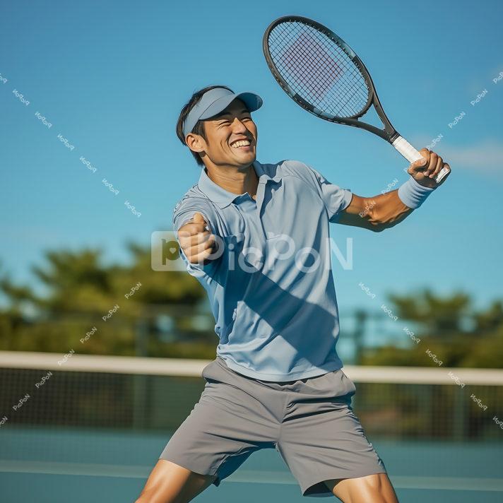テニスコート 青空の下で、空色のTシャツとグレーの半パンを履き空色のサンバイザーをつけた若者がラケットをもち、嬉しそうにガッツポーズをしている 背景に木々