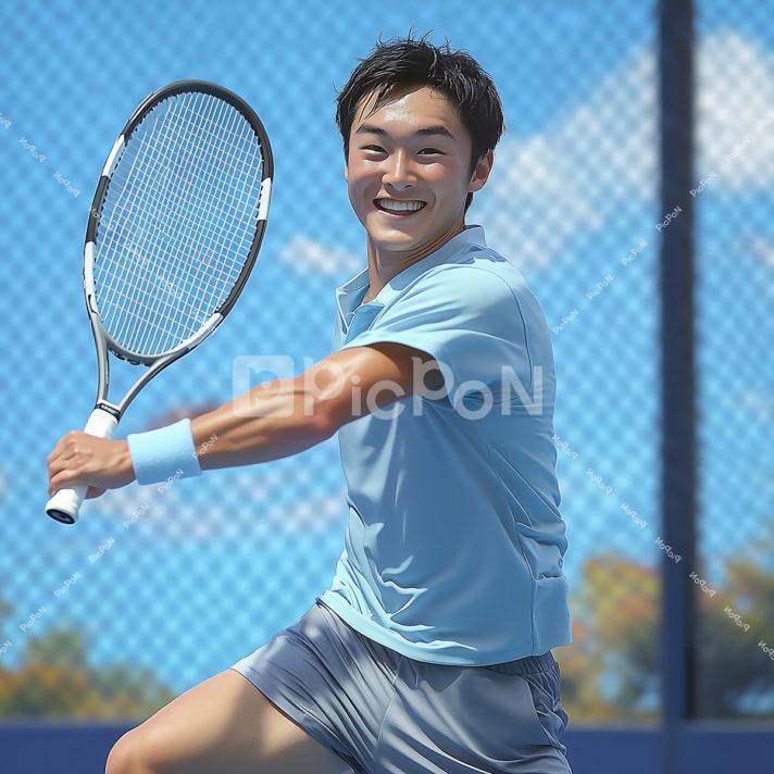 テニスコート 青空の下で、空色のTシャツとグレーの半パンを履いた若者がラケットを嬉しそうに振っている、筋肉質の腕に青いリストバンドをしている