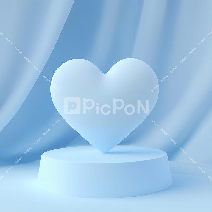 ライトブルーのソフトな感じの3Dのハートがライトブルーの台形の形をした円盤のようなものの上にのっかっている様子 ライトブルーのカーテンのような背景