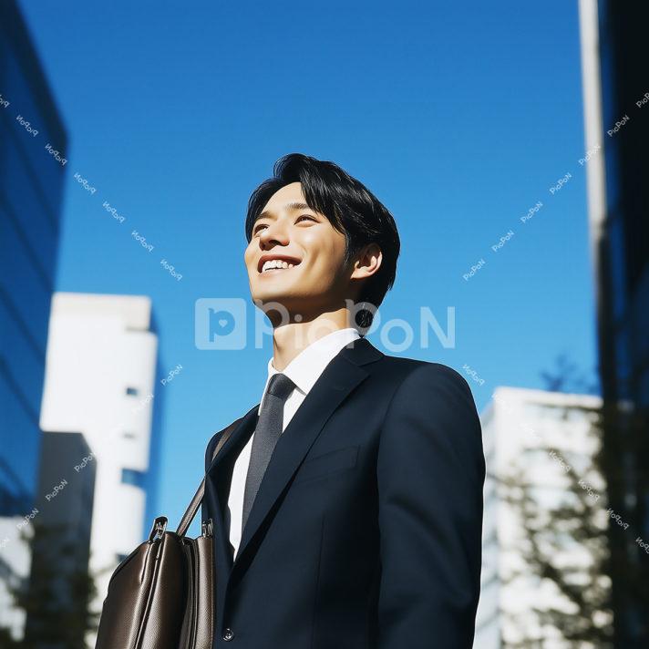 街中で濃紺の背広と白いYシャツを着てグレーのネクタイを締めた青年 肩に黒いショルダーバッグをかけ空を仰ぎ見て微笑んでいる 爽やかな笑顔 青空 ポートレート