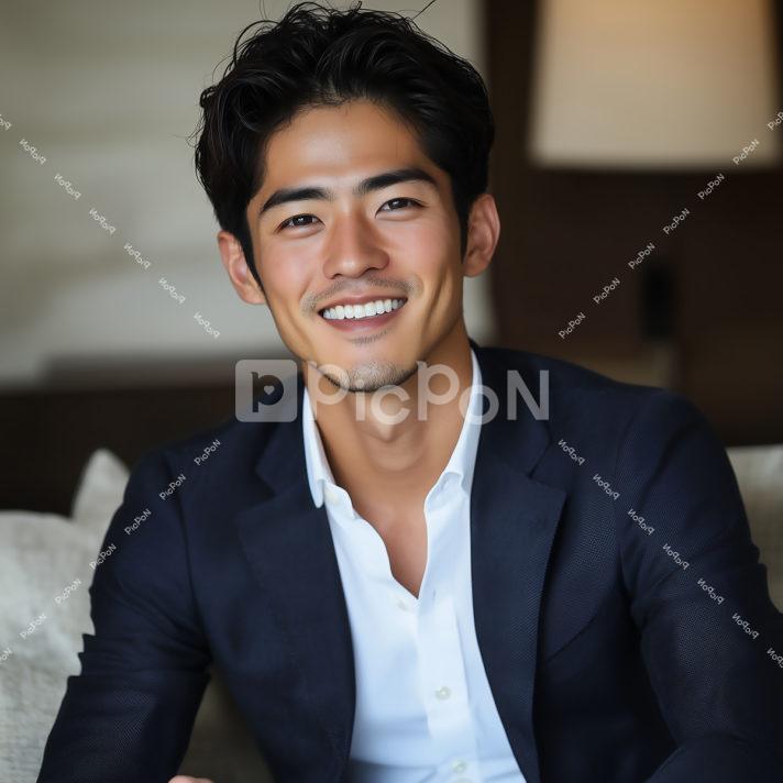 濃紺の背広と白いYシャツを着て髪をオールバックにした生還な顔立ちの青年がソファに座っている シャツの第2ボタンまで外し白い歯をみせて笑っている リラックスした様子 口の周りと顎にうっすらと髭剃りの痕 太い眉 ポートレート